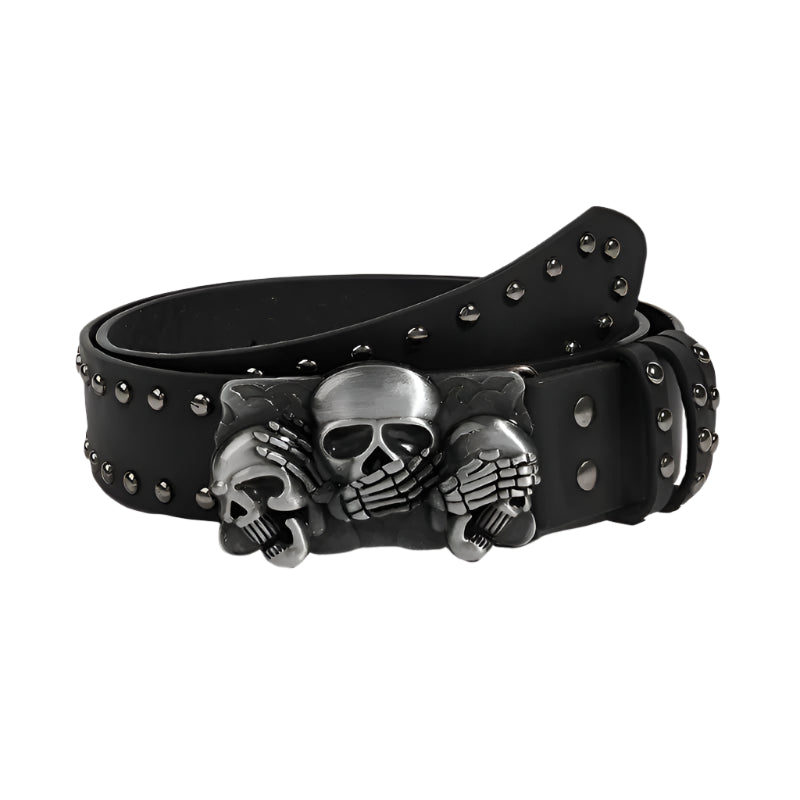 Ceinture gothique avec têtes de mort et clous - boucle avec le motif "see no evil"